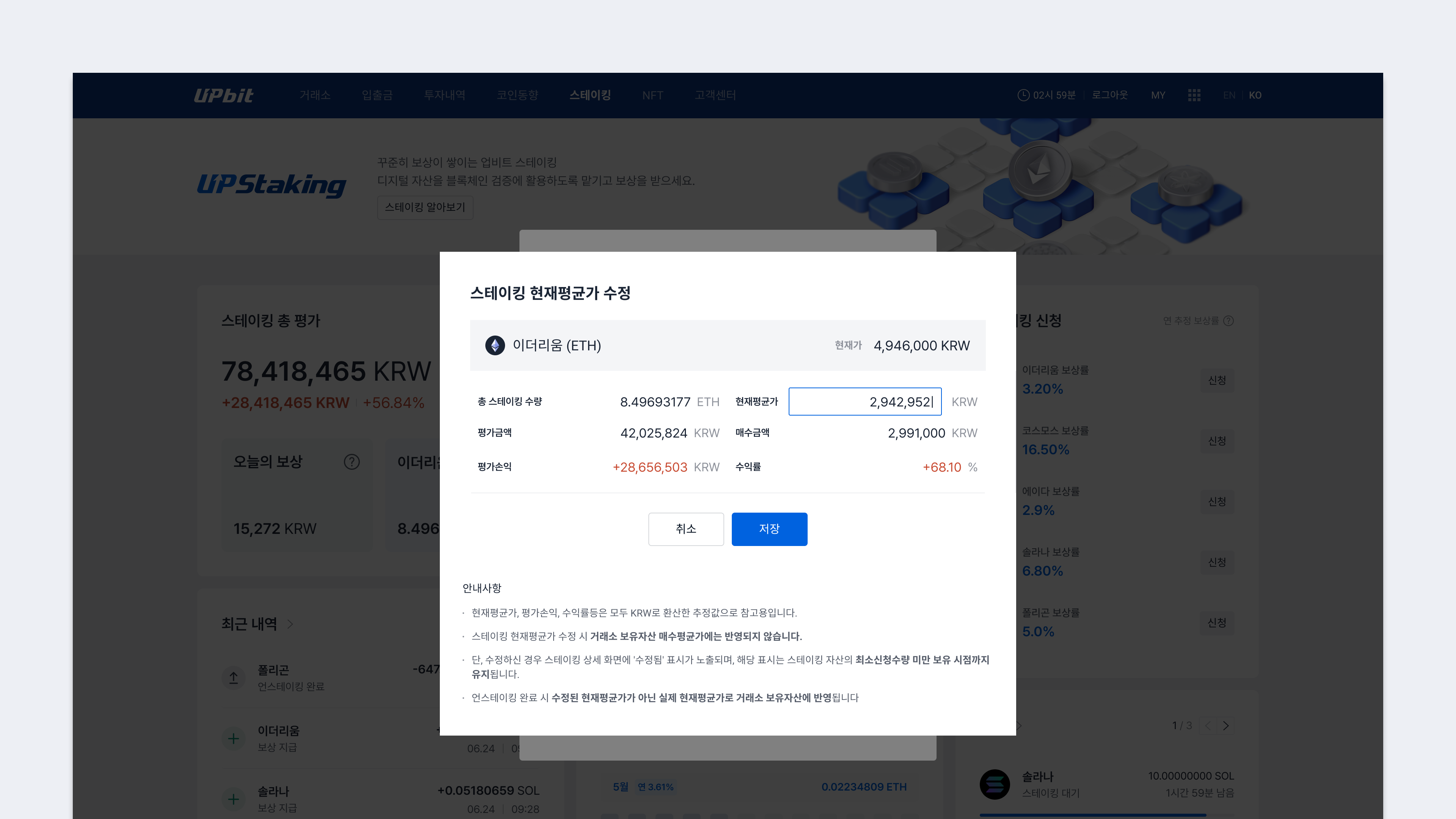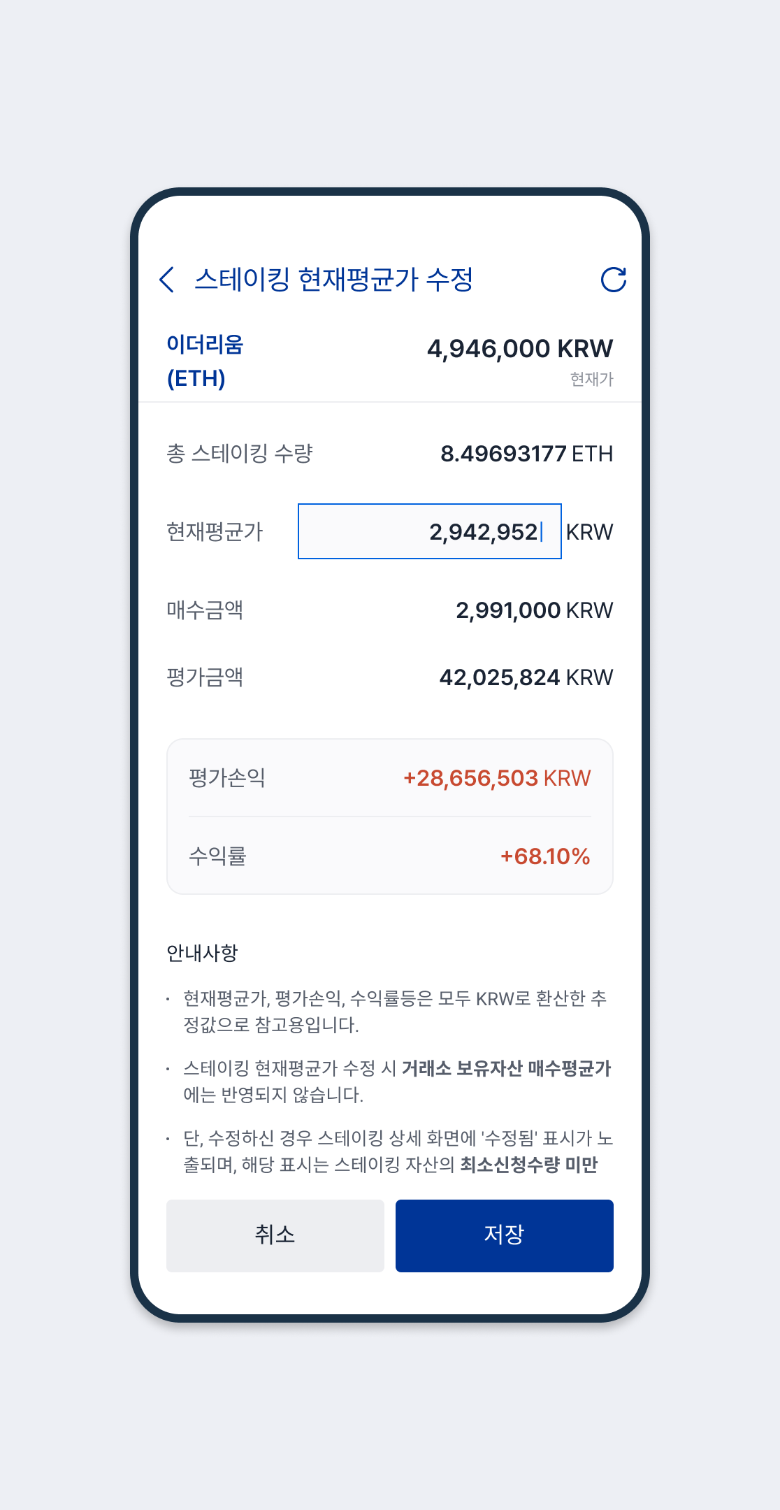 . [스테이킹] - [디지털 자산 선택] - [현재평균가 수정]